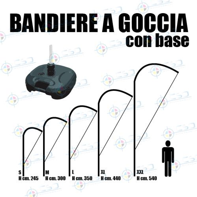 Bandiera a goccia pronta in tre giorni: stampa quadricromia, con base riempibile ad acqua (prezzo con IVA)