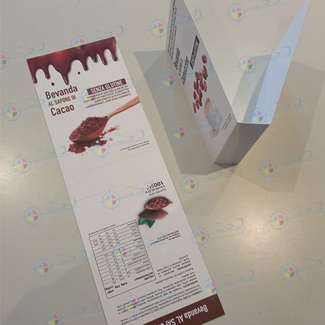 Packaging: confezione realizzata in cartoncino bipatinato ad effetto seta da 400 grammi, stampa sulle due principali facciate esterne in quadricromia.
